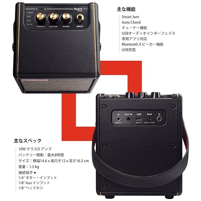 【製品仕様】10WクラスD アンプ搭載・2インチカスタムデザインスピーカー2機とパッシブラジエーター1機を搭載・Bluetooth接続に対応・接続端子:1/4” ギター・インプット/1/8” Aux インプット/1/8” ヘッドホン・バッテリー内蔵 最大駆動8時間・専用アプリ「Spark Amp」:iOS版&Android版いずれも無料・本体サイズ横幅14.6センチ x 奥行き12センチ x 高さ16.5センチ・本体重量1.5 kg・内容物:Spark MINI本体、キャリングストラップ、USBケーブル、クイック・スタート・ガイド、説明書、PreSonus Studio One Prime 無料DLの権利・保証:1年保証付き
