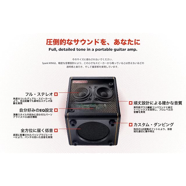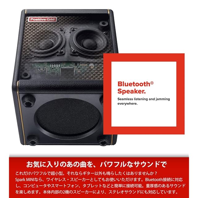 【お気に入りのあの曲を、パワフルなサウンドで】これだけパワフルで超小型。それならギター以外も鳴らしたくはありませんか?Spark MINIなら、ワイヤレス・スピーカーとしてもお使いいただけます。Bluetooth接続に対応し、コンピュータやスマートフォン、タブレットなどと簡単に接続可能。重厚感のあるサウンドを楽しめます。本体内部の2機のスピーカーにより、ステレオサウンドにも対応しています。