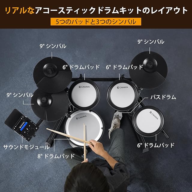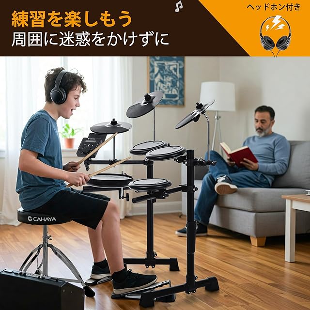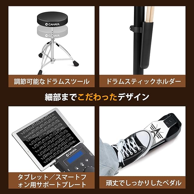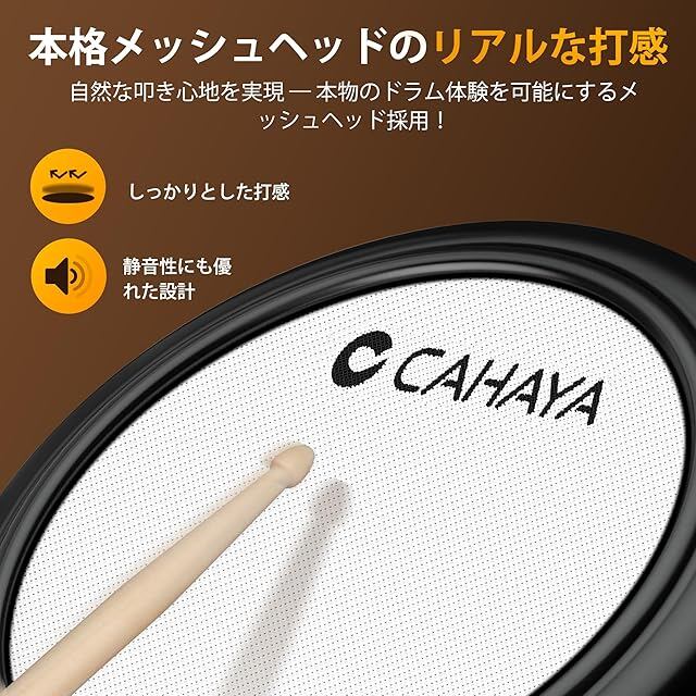 CAHAYA 電子ドラム セット ドラムスツール ヘッドフォン ペダル✕ 2付き メッシュ 初心者向け MIDI機能 ドラムスティック✕ 2付き 譜面収納 ドラムスティックホルダー付き 350種音色 25種ドラムキット 自宅練習 ギフト 子供 大人 学生 5ドラム 3シンバル