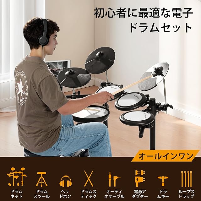 【パッケージ内容】: 8インチのスネアドラム×1、バスドラム×1、 6インチのタムドラム×3、9インチのクラッシュシンバル×1、9インチのライドシンバル×1、ハイハット×1、ハイハットペダル×1、独立ペダル×1、調整可能なドラムスツール×1、ヘッドフォン×1、ドラムスティック×2、オーディオケーブル×1、プラグ×1、プラグアダプター×2、ドラムキー×1、ループストラップ×4。
