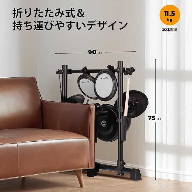【便利な収納スペース】このヘッドホン付きの電子ドラムセットには譜面収納とドラムスティックホルダーが付いており、アクセサリーの収納に便利で紛失防止にもなります。ホストには携帯電話やタブレットを収納できる収納ホルダーが装備されています。小型ドラムセットで折りたたみ式から手軽に部屋の片隅に置くことができますし、外に持ち出す際にも便利です。