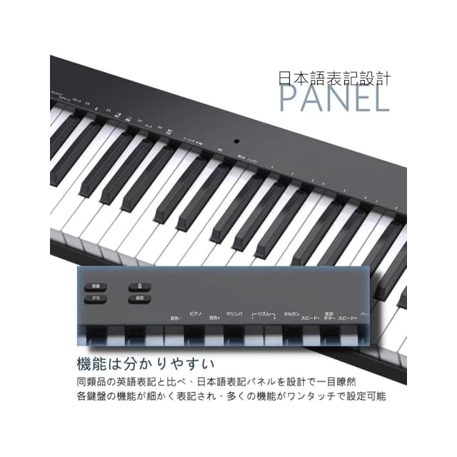 【日本語表記パネル設計&機能たっぷり】日本語表記パネル設計で同類品の英語表記と比べ、一目瞭然で機能が分かりやすいです。128種類音色、128種類リズムパターン、20デモ曲内蔵、サスティン、ビブラート、和音も対応可能!更に、知能ピアノサウンド処理チップが採用、最新の高音質スピーカー二つが商品の両側にも設置され、音の広がりと豊な音場を味わうことができます。