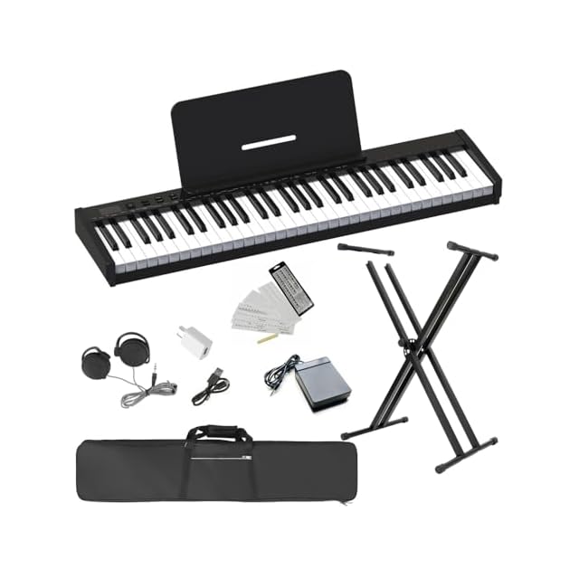 【ピアノスタンドセット】Longeye ロンアイ 電子ピアノ 61鍵盤 10㎜ストローク 超小型 持ち運び便利 初心者 練習にピッタリ バッテリー内蔵 長時間利用可 スタンド付き ペダル付き 収納バッグ付き MIDI対応 譜面台 鍵盤シール イヤホン (黒セット)