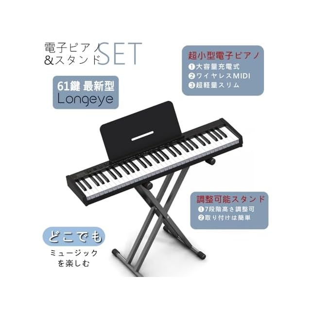 【高品質専用スタンド付きで超お得セット】置台の悩みがなし、一個買えばピアノとスタンドを手に入れます。【コンパクトで移動や納も楽】longeye 61鍵盤電子ピアノは現在世界最も小さいサイズを誇る電子ピアノです。長さはわずか87cmで、重さは約3.6㎏。純粋バッグ付き、外出でもすぐ連れて行け、練習にピッタリです。