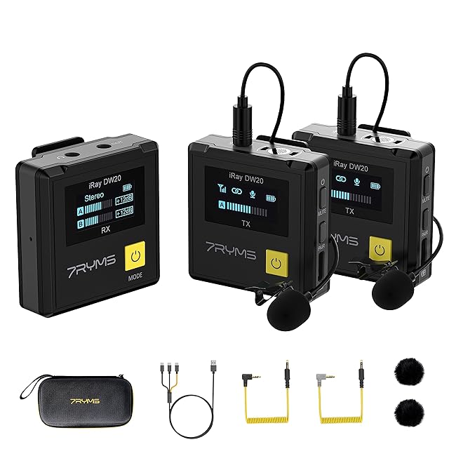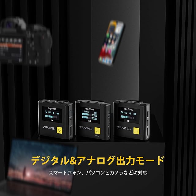 [幅広い互換性]7RYMS iRay DW20 2.4Gデュアルチャンネルワイヤレスマイクは、スマートフォン、パソコン、カメラなどに幅広く対応し、生放送、インタビュー、録音、番組収録、マイクロビデオ撮影、日常の撮影などのシーンで使用することが可能です。 映像クリエイターにとって最適な選択です。