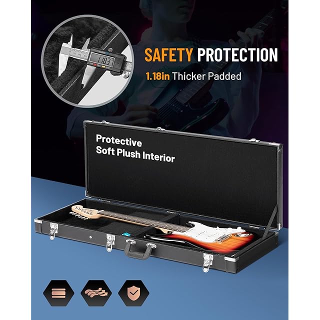 【絶妙な詳細】内部柔らかいアクリルぬいぐるみ裏地とパッド入りネックサポートはエレキギターをよく保護できます。外部3つの金属ヒンジはふたをしっかりと固定できます。また、本体重量は約6kgです。