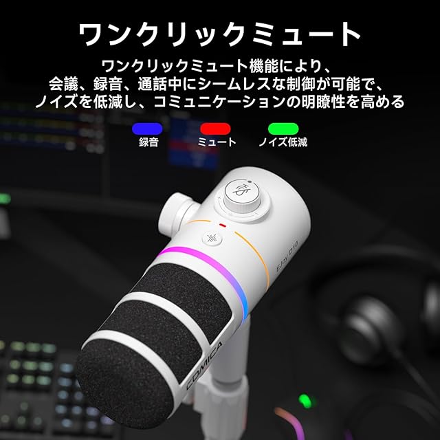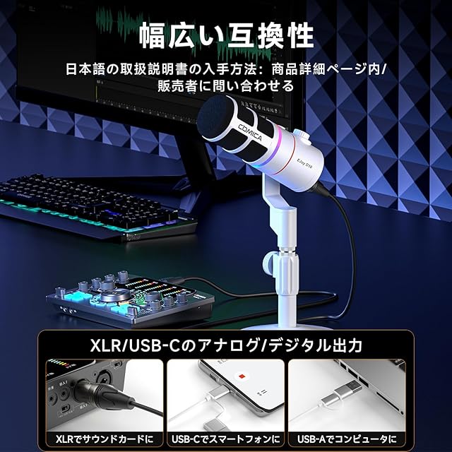 Comica ダイナミックマイク USB/XLRデジタルとアナログデュアル出力 ゲーミングマイク 単一指向性 RGBライティング ノイズ軽減 ライブ配信 ゲーム実況 在宅勤務 ポッドキャスト ストリーミング ナレーション録音に最適 PC/PS4/PS5/サウンドカード/オーディオミキサー対応 EJoy D10(白)