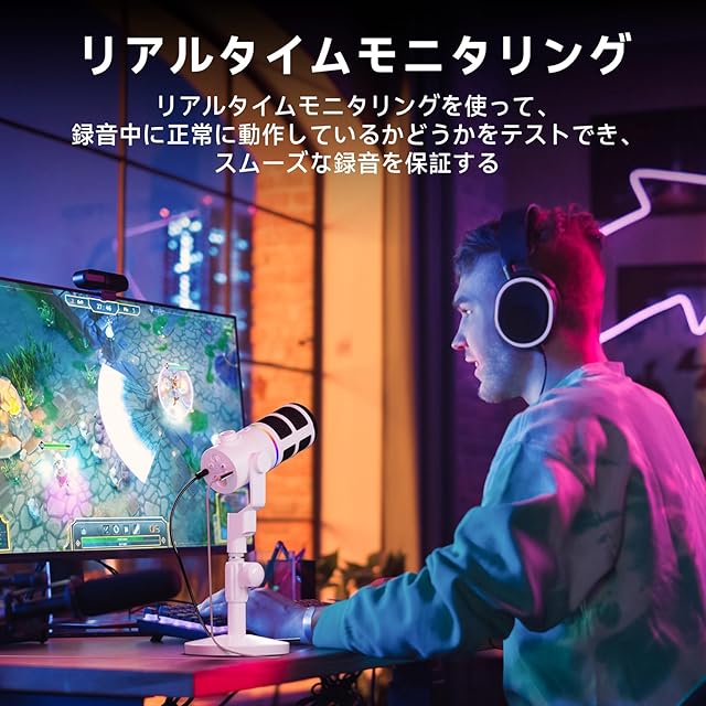 【モニタリング】マイクの3.5mmヘッドホンジャックにイヤホンやヘッドホンの接続端子を差し込むことで、自分の声にフォーカスしながら音声を録音し、遅延なくモニタリングできます。 ゲーム実況、ボイスチャットまたはライブ配信中に音量のバランスを適切に調整することができます。