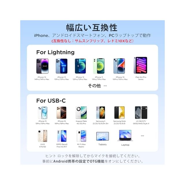 【2in1互換性】BY-V3 ComboはUSB-CとLightningの2つの異なる受信機を搭載しており、幅広いデバイスに対応します。iPhoneやiPad、またはUSB-Cポートを搭載したHuawei、Xiaomi、Samsungなど、さまざまな機器と簡単に接続でき、用途の幅が広がります。接続前に、Androidスマートフォンの設定でOTG機能をオンにしてください。