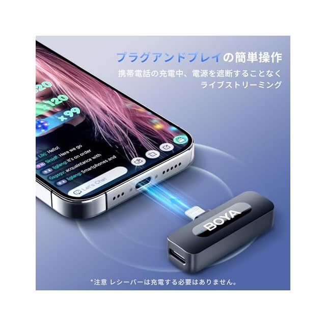 【プラグアンドプレイ、簡単操作】受信機は複雑な設定なしで直接スマートフォンに接続でき、簡単に接続してすぐに高品質なオーディオ体験をお楽しみいただけます。受信機の側面にあるポートは、録音中にスマートフォンを充電できるため、バッテリー切れの心配もありません。
