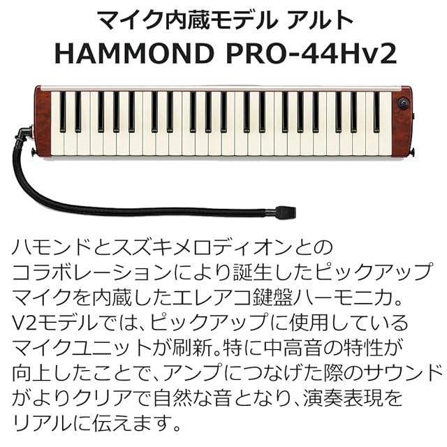 【スズキ 鍵盤ハーモニカ ハモンド セット説明2】 HAMMOND PRO-44Hv2は、スズキ とハモンドのコラボレーションにより生まれた 鍵盤ハーモニカ です。ピックアップマイクを内蔵し、自然な音色を保ちながら高音質を提供します。