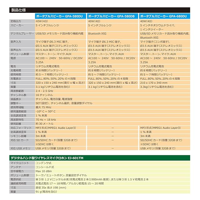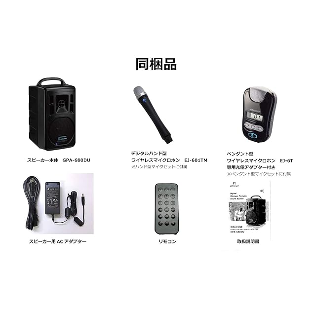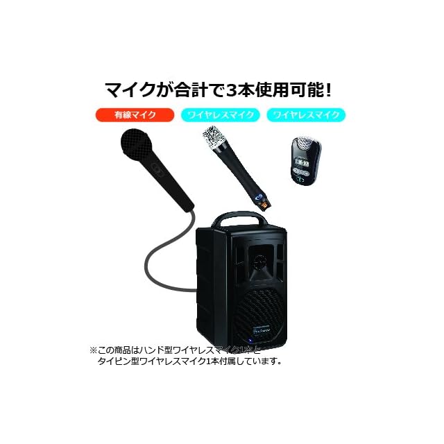 ワイヤレスチューナー2波内蔵(同梱のマイク2本が同時使用可能)ワイヤレスハンドマイク1本とペンダント型マイク1本同梱。有線マイク入力、LINE IN/OUT、マイクミュート機能搭載。