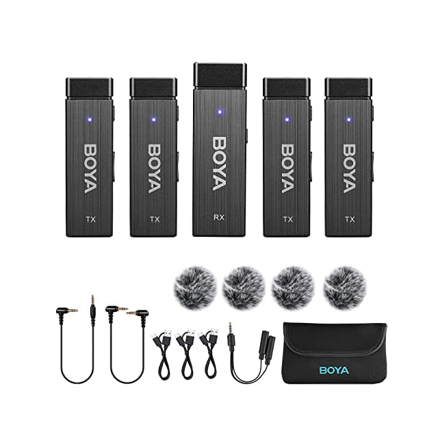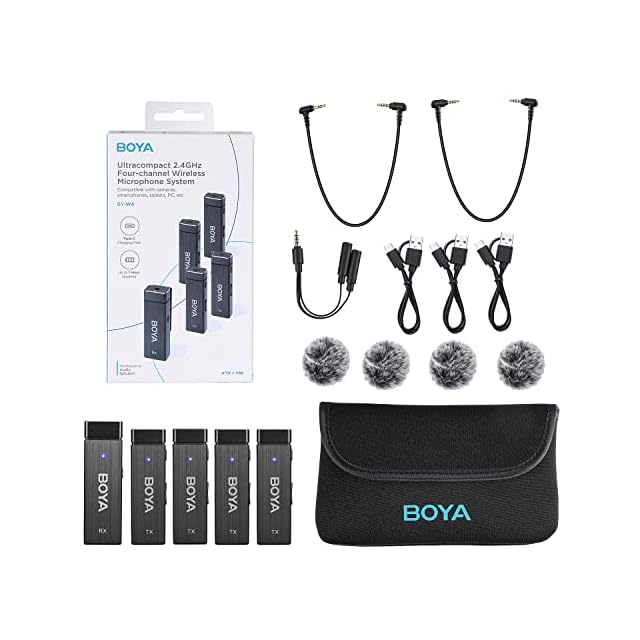 BOYA BY-W4 ミニポータブル 無指向性集音ワイヤレスマイク ピンマイク ワイヤレスラベリアマイク マイク 瞬間接続 4チャンネル 7時間超長寿命 2人または4人同時使用可能 2.4GHz 30m伝送 カメラ、携帯電話、タブレットなどに対応 コンテンツ制作、ライブストリーミング、Vlog、TikTok、Yutube、INS、動画、モバイルニュースなどのシーンに最適(送信機*4 受信機*1)