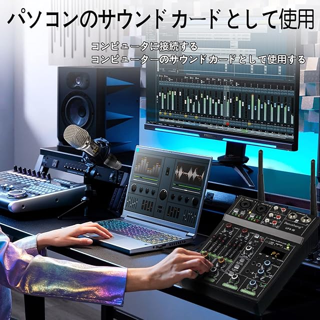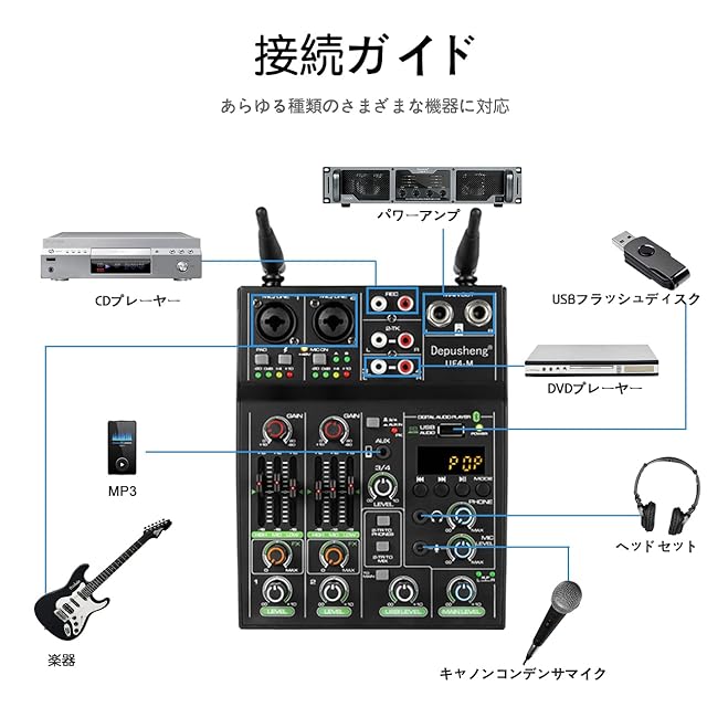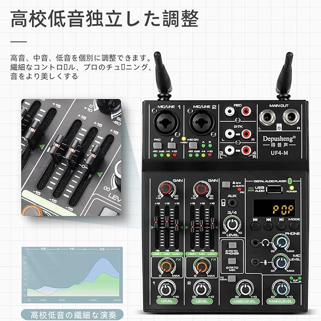 Depusheng Studioオーディオサウンドミキサーボード-4チャンネルBluetooth互換プロフェッショナルポータブルデジタルDJミキシングコンソール(ワイヤレスマイク付き)-スタジオレコーディング用ミキシングボード