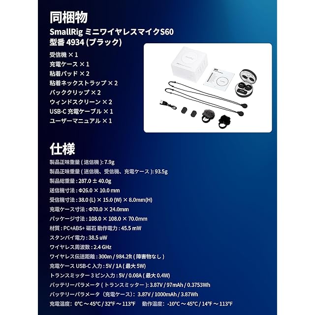 【同梱物】マイク送信機(TX)x 2、受信機(RX)x 1、充電ケースx 1、粘着パッドx 2、粘着ネックストラップx 2、バッククリップx 2、毛皮の風防x 2、USB-C充電ケーブルx 1、ユーザーマニュアルx 1。