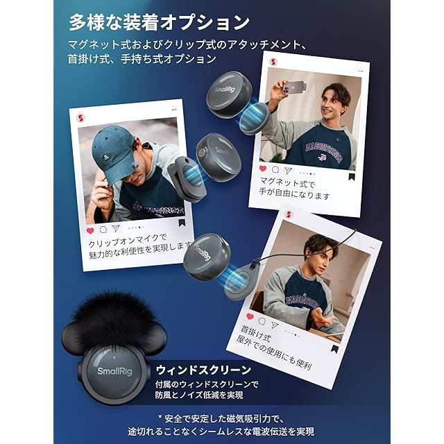 【多様な装着オプション】さまざまなアクセサリを備えたこのマイクは、首にかけるマグネット式アタッチメント、首にかけるタイプ、手持ちタイプ、クリップオンタイプなど、多彩な装着オプションを提供します。さらに、シリコンマウントに取り付け可能なウインドスクリーンの使用をサポートしており、防風効果とノイズ低減効果が得られます。