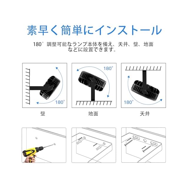【簡単安装】この LED ライトには、天井、壁、T ビーム、または単に床、テーブルなどお好きな場所に取り付けるための取り付けアクセサリが含まれています。 照射角度は調整可能です。