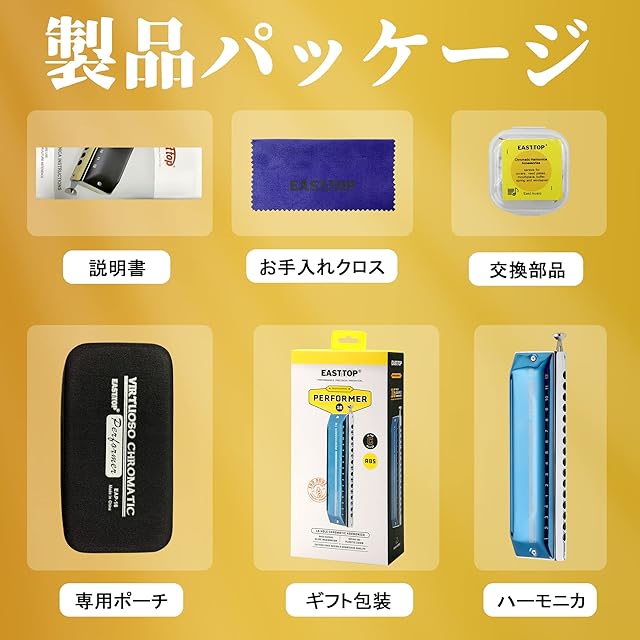 仕様調子:クロマチックハーモニカ C调;音域:16ホール64トーン;重量:約495g(本体) 寸法:約19.5*4.5*3.3cm