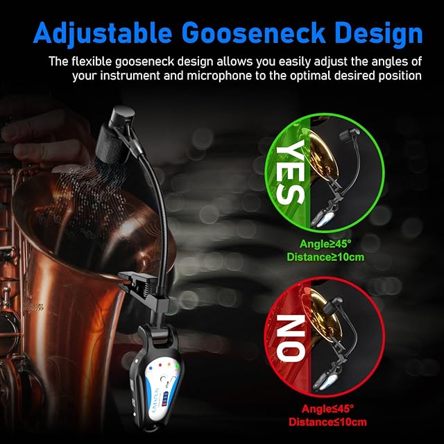 【調節可能なグースネック】本サックスワイヤレスマイクは、調節可能で柔軟なグースネック設計を採用しており、グースネックは必要に合わせて調整でき、さまざまな金管楽器に適しています。マイクのクリップの開口部にはシリコンゴムの層が追加されています。楽器にしっかりとクリップでき、跡を残さずに楽器を保護します。