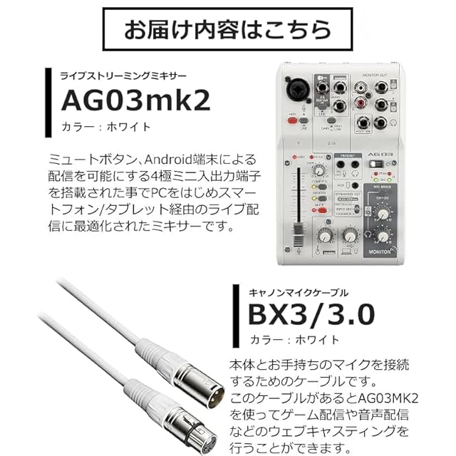 【セット買い】ライブストリーミング AG03MK2 W & BX3/3.0 WH キャノン マイクケーブル XLR 3.0m 配信機材 2点セット