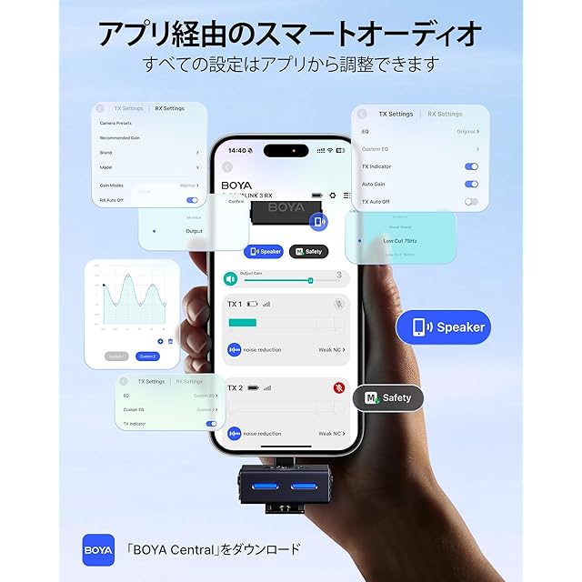 ディープニューラルネットワーク(DNN)チップを搭載したBOYALINK 3は、背景ノイズをリアルタイムで識別・抑制することで、音声をインテリジェントに分離します。過渡ノイズに対して最大40dB、定常ノイズに対して最大21dBのノイズ除去を実現し、街中から建設現場まで、さまざまな環境で明瞭度を確保します。
