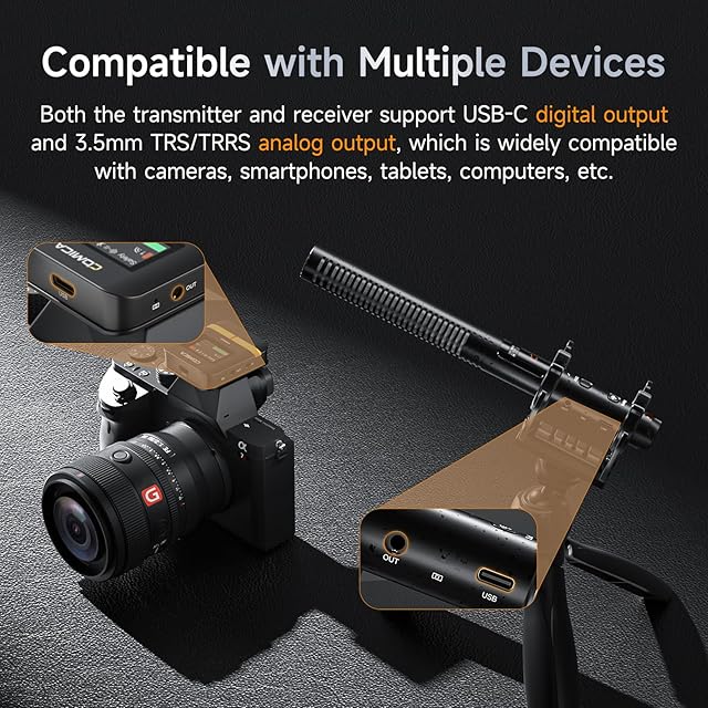 【USB Type-Cデジタル&3.5mmアナログ出力】VM40ガンマイク送信機と受信機はワイヤレスと有線モード時、USB Type-Cデジタル出力と3.5mmアナログ出力に対応しています。カメラ、ビデオカメラ、スマートフォン(iPhone 15以上な対応)、PCと互換性があります。VLOG、LIVE、動画撮影、Web会議、オンライン授業、ネットミーティング、講演会、研修会、ストリーミング、インタビュー、音声収録に適用可能。