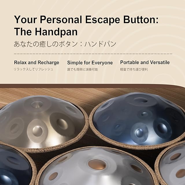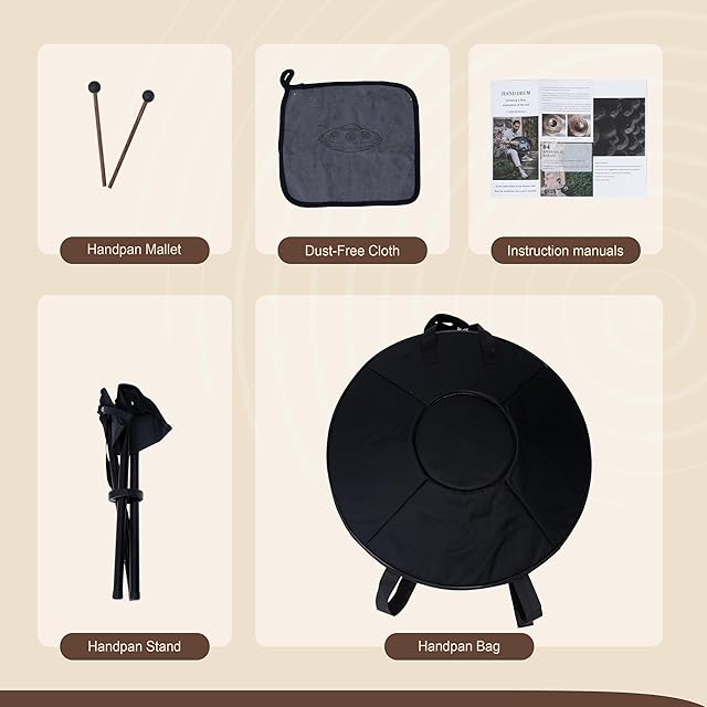 【必要なものがすべて揃うオールインワンセット】 ハンドパンドラム x1,ソフトバッグ x1,ハンドパンマレット x2,ハンドパンスタンド x1,音符ステッカーセット x1,クリーニングクロス x1,ロープ付きペア x1