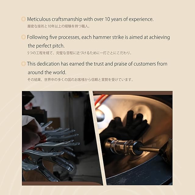 【10年以上の手鍛冶制作の専門技術】Sarospanは10年以上にわたり、スイスやスペインの専門家と協力し、プレミアムな手鍛冶を精密に制作してきました。低音域、中音域、高音域すべてにおいて、深みのある幻想的な音色と完璧な調和をお届けします。手作業で一つ一つ音を調整し、最もバランスの取れた完璧な音を追求しています。