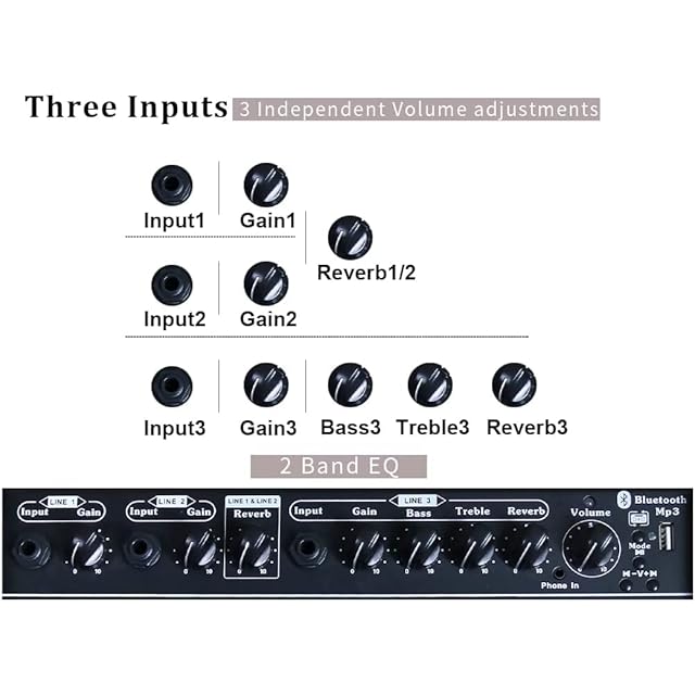 【3チャンネル】ギター、ピアノキーボード、マイクなど、3種類の楽器を接続できます。2バンドバランスは、さまざまな音楽スタイルのニーズに対応し、内蔵のリバーブ効果により、自然でエコーのようなサウンドを実現します。