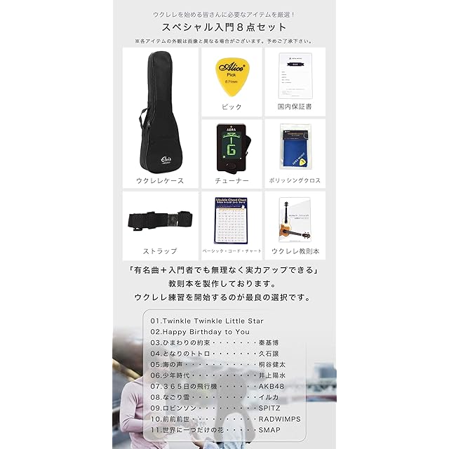 【より豊富な付属品8点セット】ウクレレをこれから始める皆さまに必要なアイテムを厳選! 付属品内容:安心を保証する国内保証書(保証期間3年)、チューナー、名曲11選のウクレレ教則本、ベーシック・コード・チャート、ピック、ストラップ、ポリッシングクロス、ソフトケースも付いています。他社ペラペラのケースと違い、クッション入り(5mm厚さ)のケースが付いています。大事なウクレレを衝撃から守ります。