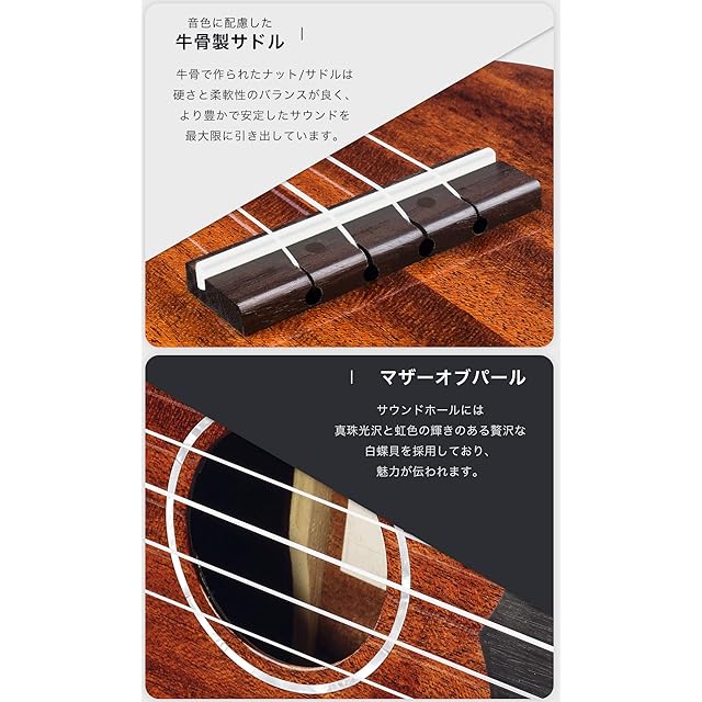【目を奪う。耳が驚く。】ヘッドに貴重なローズウッドの化粧板を貼りつけてドレスアップした上、キレイなインレイを一つひとつ丁寧に手作業で嵌め込み、最後に美しい光沢を放つ鏡面仕上げを行うことで、より一層華やかな雰囲気をまとっています。また、牛骨で作られたサドルも良質で、より豊かで安定したサウンドを引き出しています。そして、クローズドバックのペグは、オープンバックのペグと比べより細かく合わせやすく、チューニングが安定しやすいです。
