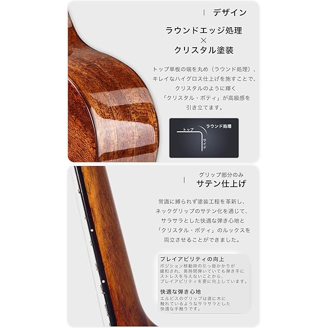 【ELVISだけの魅力】よりスタリッシュなデザイン、より優れたプレイアビリティ。ELVIS単板ウクレレHiloシリーズのマホガニー仕様(トップ単板)です。ハイグロス仕上げ、ラウンドエッジ加工、キレイな白蝶貝インレイ、軽量で高精度なペグ、ミニマルなデザインなど、ELVIS Hilo 1を構成するすべての要素が美しく連係しています。