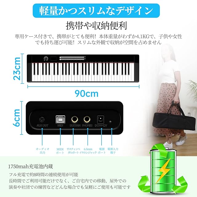 【軽量&充電式&携帯便利】TS02キーボードピアノは、軽量かつスリムなデザインを採用しており、携帯や収納はとても便利です。本体重量がわずか4.1kgで、子供や女性でも持ち運べます。スリムな外観で収納が空間を占めません。内蔵の1750mahバッテリーにより、室内の演奏だけでなく、屋外での演奏や集団練習、野外コンサートなどでも自由に演奏可能です。