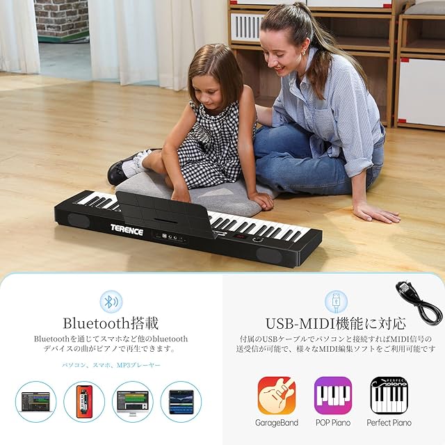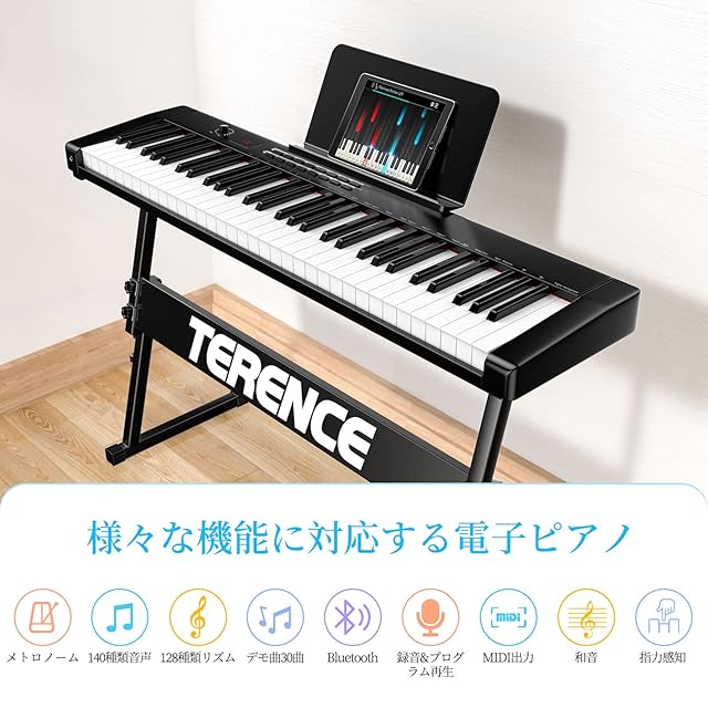 TERENCE 電子ピアノ 61鍵タッチレスポンス鍵盤 2025年改良モデル キーボードピアノ キーボードスタンド付き MIDI対応 ステレオスピーカー搭載 電子キーボード メトロノーム/録音/プログラム機能 充電可能 レッスンモード 初心者/子供に最適 コンパクト 持ち運び便利 日本語取扱説明書付き ブラック TS-02