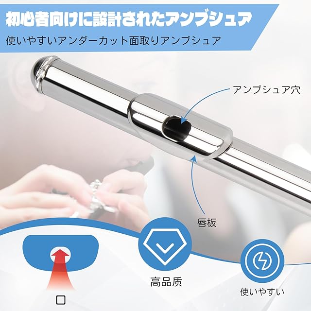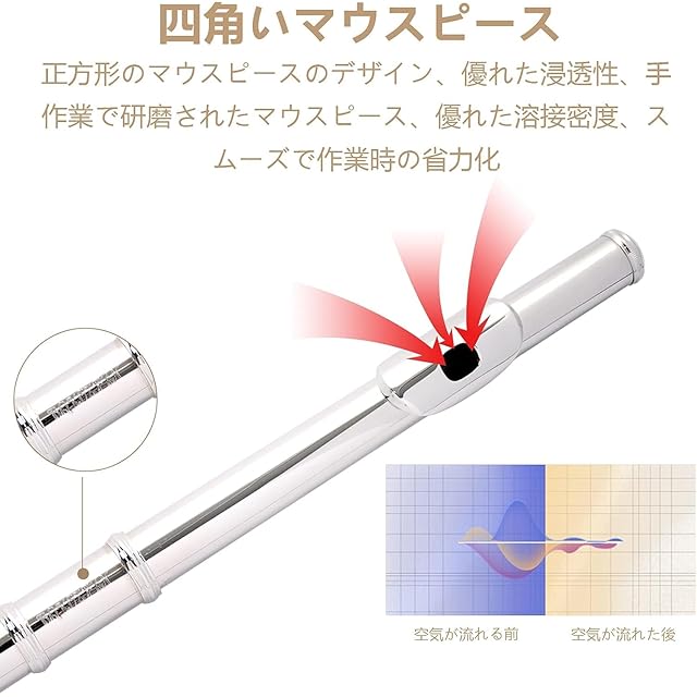 【美しい音色】明るい音色で鳴らし易く重量のバランスが良くて魅力的な音色を奏で、親しみ深いフルートで、発音にリードを用いないため、他の管楽器よりもタンギングの柔軟性が高いフルートです。