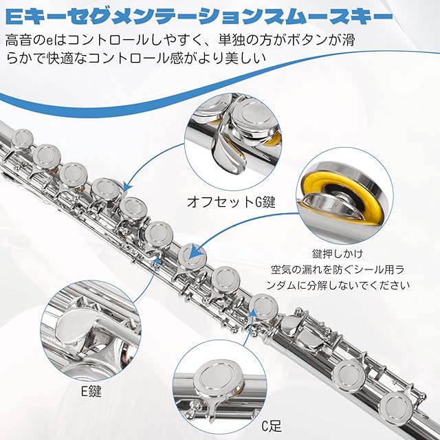 【高品質】高い耐久性と素晴らしい音色、優れた響き、爆発性に大きな違いをもたらします。深くダークな音色で、奏者のパワーにしっかりと確実に応える響きが特長です。高級な銀メッキの16キーカバード/リングキーCフルートには、オフセットGキーとEメカを付き、一流の音質と音色は、愛する方や初心者などにぴったりのギフトです。