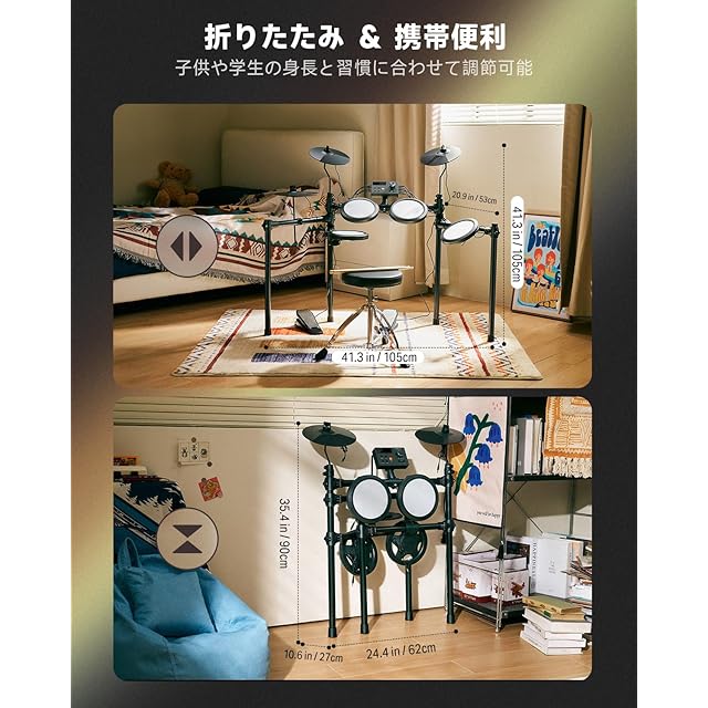 ✨【省スペース&調節可能】強化されたドラムフレームは軽量かつ折りたたみ可能なので、このドラムセットを気軽に持ち運びますし、収納にも簡単です。それに、ドラムとシンバルの角度と高さは、お子様の身長の変化や使用習慣に合わせてすばやく柔軟に調整でき、練習時の快適さと適切な姿勢を保ちながら、子どもの成長を伴います。