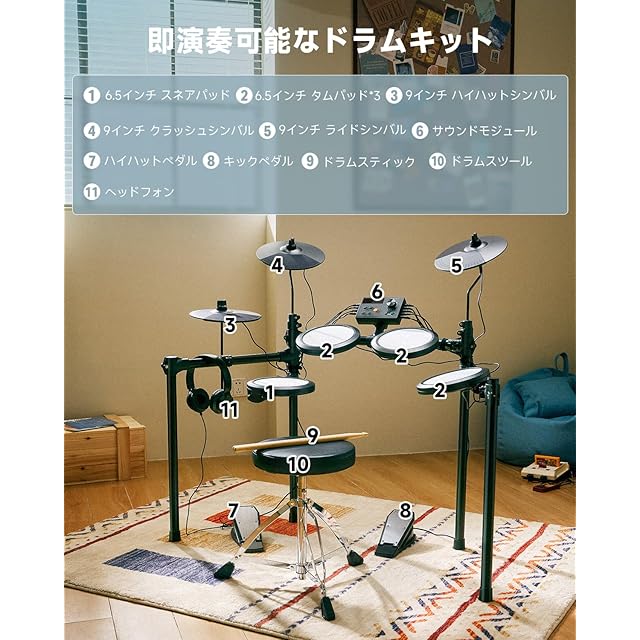 【防音で情熱解放】付属のヘッドホン接続時の静音設計。深夜練習も近所配慮不要、集中練習環境を生み出します。ドラムスローン、ヘッドホンとスティック付属で、開封即スタート可能。叩けば叩くほど上達するDonner DED-70の次世代型電子ドラムです。