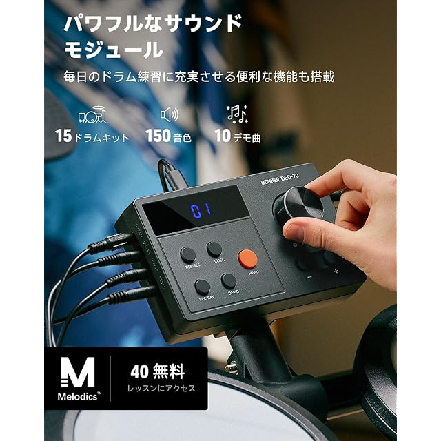 ✨【バージョンアップされた音源】DED-70 NEW 電子ドラムセットはアコースティックドラムをサンプリングした150種サウンド、15種ドラムキット、10曲のデモソング、その他にもリズム感覚を楽しく磨ける機能を内蔵したドラムモジュールを搭載しています。集中力が途切れがちなお子様が、楽しみながら集中して練習できるように工夫されています。複雑すぎることなくリズムの基礎を学びたい6~14歳の初心者に最適