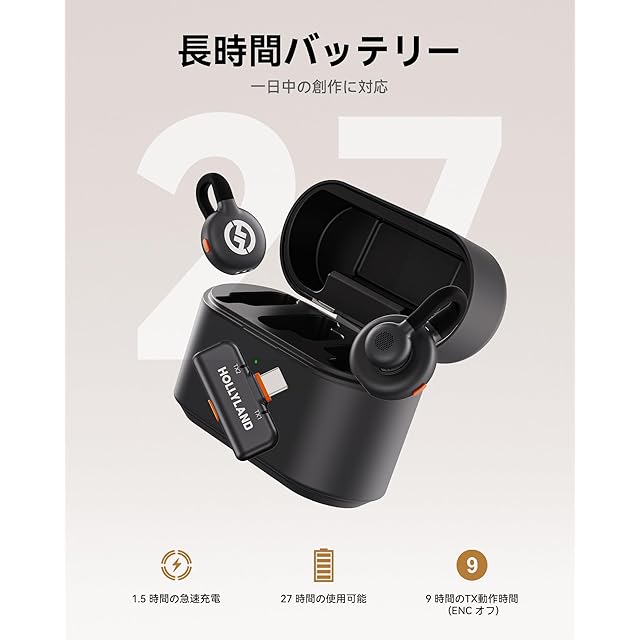 【充電ケース付き・バッテリー長持ち】 1.5 時間の急速充電で、送信機/受信機 1 台あたり 9 時間の使用時間 (ノイズキャンセル オフ) をお楽しみいただけます。充電ケースで2.5回のフル充電が可能になり、最大27時間のバッテリー駆動時間を実現し、一日中創造性と生産性を維持できます。