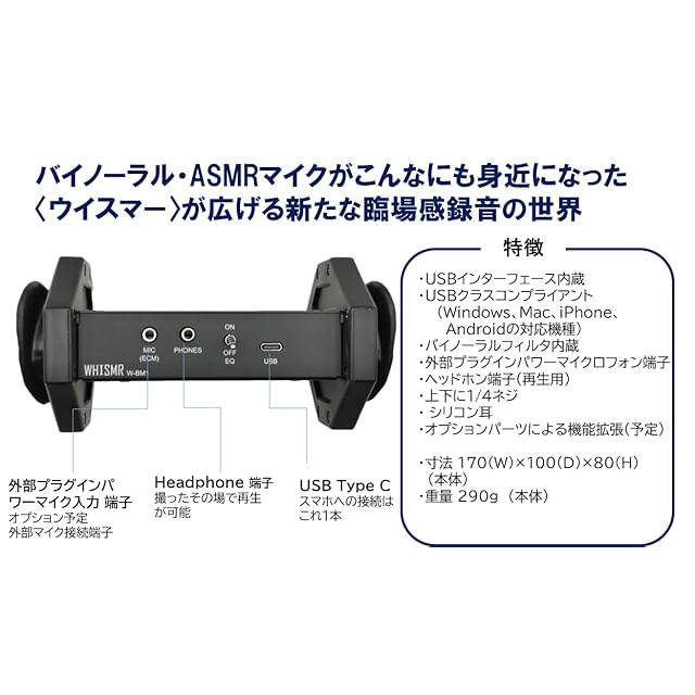 WHISMR〈ウイスマー〉 W-BM1 バイノーラルマイク ASMRマイク USBマイク シリコン製耳