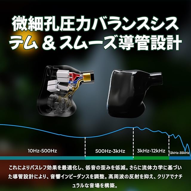 【進化したハイブリッドドライバーシステム】2つのダイナミックドライバーが迫力のある低音を、マイクロプレーナードライバーが水晶のようにクリアな高音を再生。AFUL独自のRLCネットワーククロスオーバー技術により、各ドライバーが完璧に連携。楽器の分離度と音場の広がりが格段に向上しています。安定した接続を確保するために、ヘッドフォン ジャックを抜き差しするときに少し力が必要です。音響調整の要件により、左耳フィルターと右耳フィルターの角度が若干異なる場合があります。
