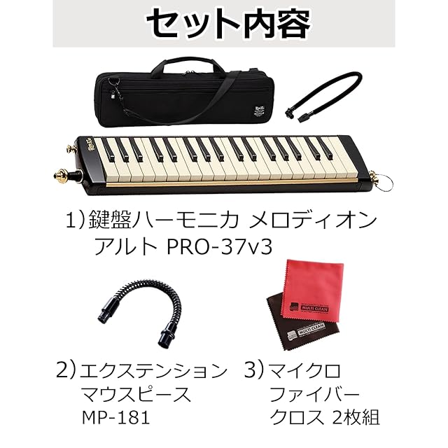 【メロディオン スズキ 鍵盤ハーモニカ 3点セット】 こちらは鍵盤ハーモニカ メロディオン アルト PRO-37v3とエクステンションマウスピース MP-181とマイクロファイバークロスのセットになります。