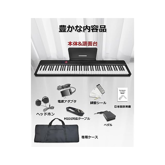 【機能たっぷり】129種類音色、128種類リズム、60デモ曲内蔵、録音、テンポ、2人鍵盤、メトロノーム、サスティン、和音。【充実な付属品】譜面台、ペダル、専用ケース,電源アダプター、2メートル特製の練習用イヤホン、初心者用の鍵盤シール、日本語説明書が付属されます。【1年保証】ご購入頂いた日から30日以内無条件返品・返金保証、何か不明があったらぜひお気軽にお問い合わせください。