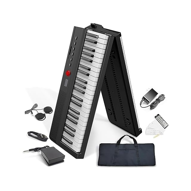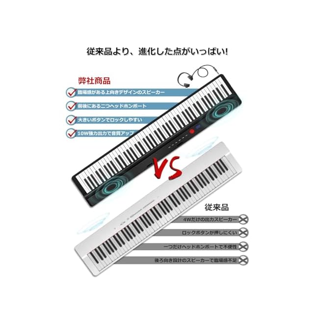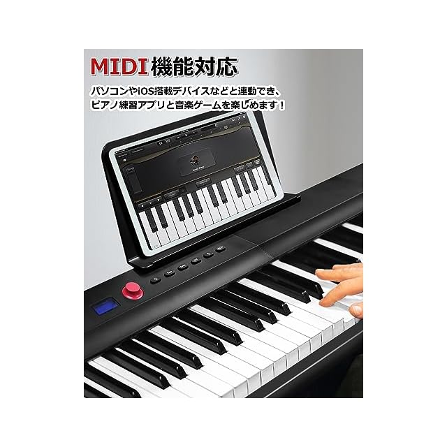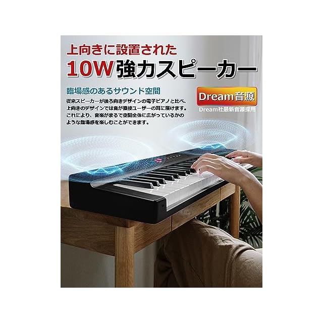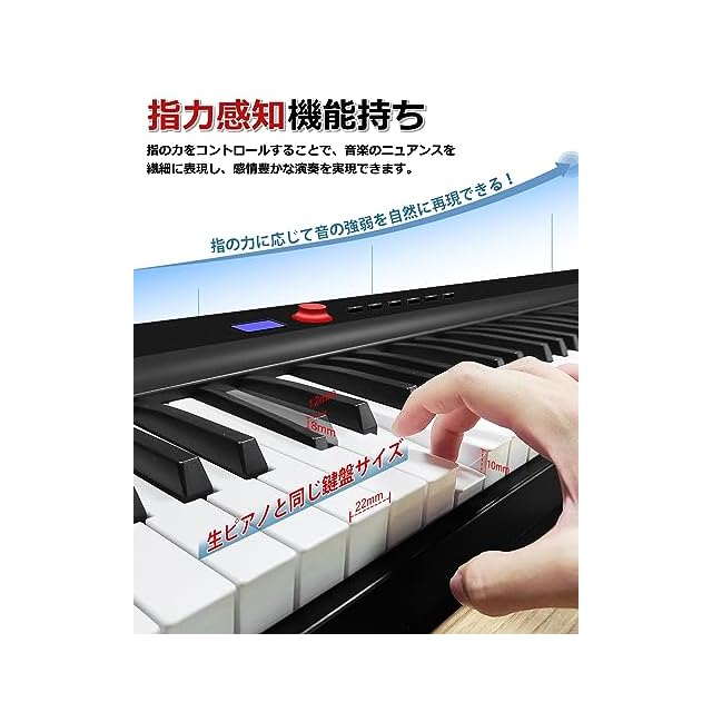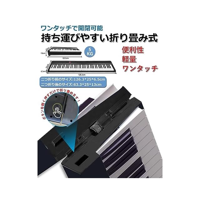 【指力感知機能持ち】指力感知機能センサーが搭載されることにより、演奏者の指の力に応じて音が変化できます!【折り前後のサイズと軽量で携帯便利】ピアノ本体は二つ折り前のサイズは126.3*25*6.5cm、二つ折り後のサイズは63.3*25*13㎝です。本体重量がわずか5kgで、専用ケースも付いているので、専用ケースも付属しており、音楽が必要な場所に持参し、どこでもコンサートを楽しむことができます。