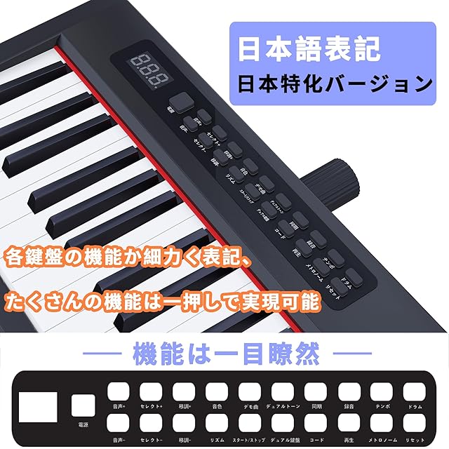 【多機能、日本語パネルデザイン】Kimfbay 88鍵電子ピアノは、380の音色、128のリズム、80の内蔵デモ曲、録音、2人用キーボード、移調、メトロノーム、サステイン、コードなど、初心者に必要な機能を多数搭載しています。Kimfbayキーボードピアノのボタンと機能説明はすべて日本語で、初心者やお子様でも簡単に操作できます。