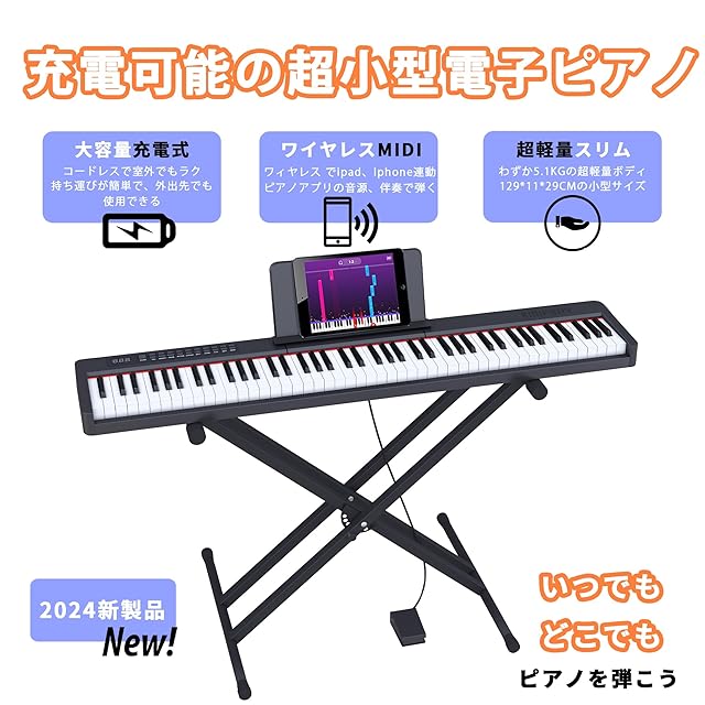KIMFBAY 電子ピアノ 88鍵盤スタンド付き 軽量 ポータブル 電子 ピアノ 88鍵 Piano ミニ 持ち運び スリムデザイン ペダル付き 子供 初心者セット MIDI対応 バッテリー内蔵 充電型 ピアノ 楽器 ブラック