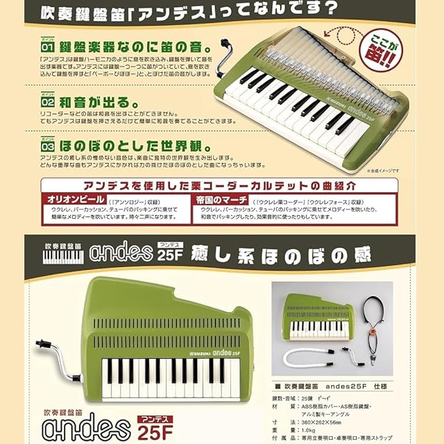【鍵盤リコーダー スズキ セット説明1】①鍵盤リコーダー アンデス andes 25F グリーン リコーダーの暖かみある音色と鍵盤楽器の演奏性を融合させた スズキ の楽器は、独特な音楽体験を提供します。鍵盤リコーダー スズキならではのシンプルな操作性と豊かな音色が、幅広い層に愛されています。