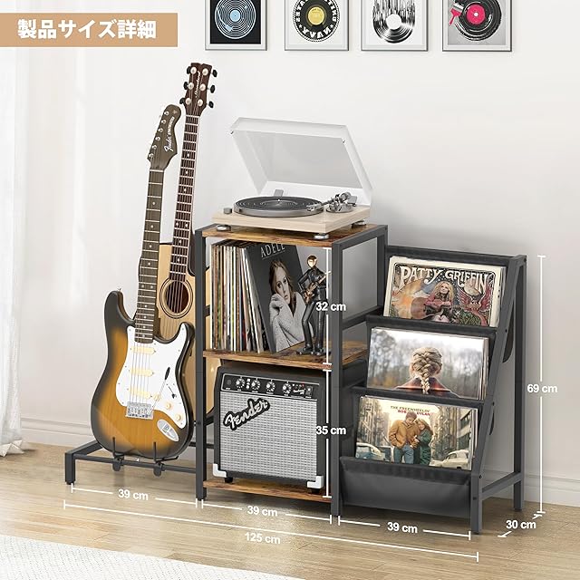 組み立て簡単:当社のレコードラックとギタースタンドは、モダンスタイルとレトロスタイルを融合したデザインです。お持ちのどのスタイルの家具とも調和します。このレコード棚は、ギターやレコードが好きなご家族や友人への贈り物に最適です!分厚い梱包材でレコードプレーヤースタンドとギターホルダーのすべての部品をしっかり保護。詳しい組立説明書が同梱されているので、簡単に組み立てられました。製品サイズ: 30cm(奥行き)×125cm(幅)× 69cm(高さ)