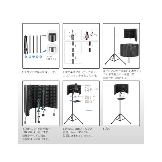 【梱包には】マイクアイソレーションカバー*1、金属ねじアダプタ*2(ほとんどのマイクに適合)、POPフィルタ*1、収納台*1、調整可能スタンド*1、取扱説明書が含まれます。 (仕切りカバーの高さは自由に調節できます(*注:マイクは含まれていません。